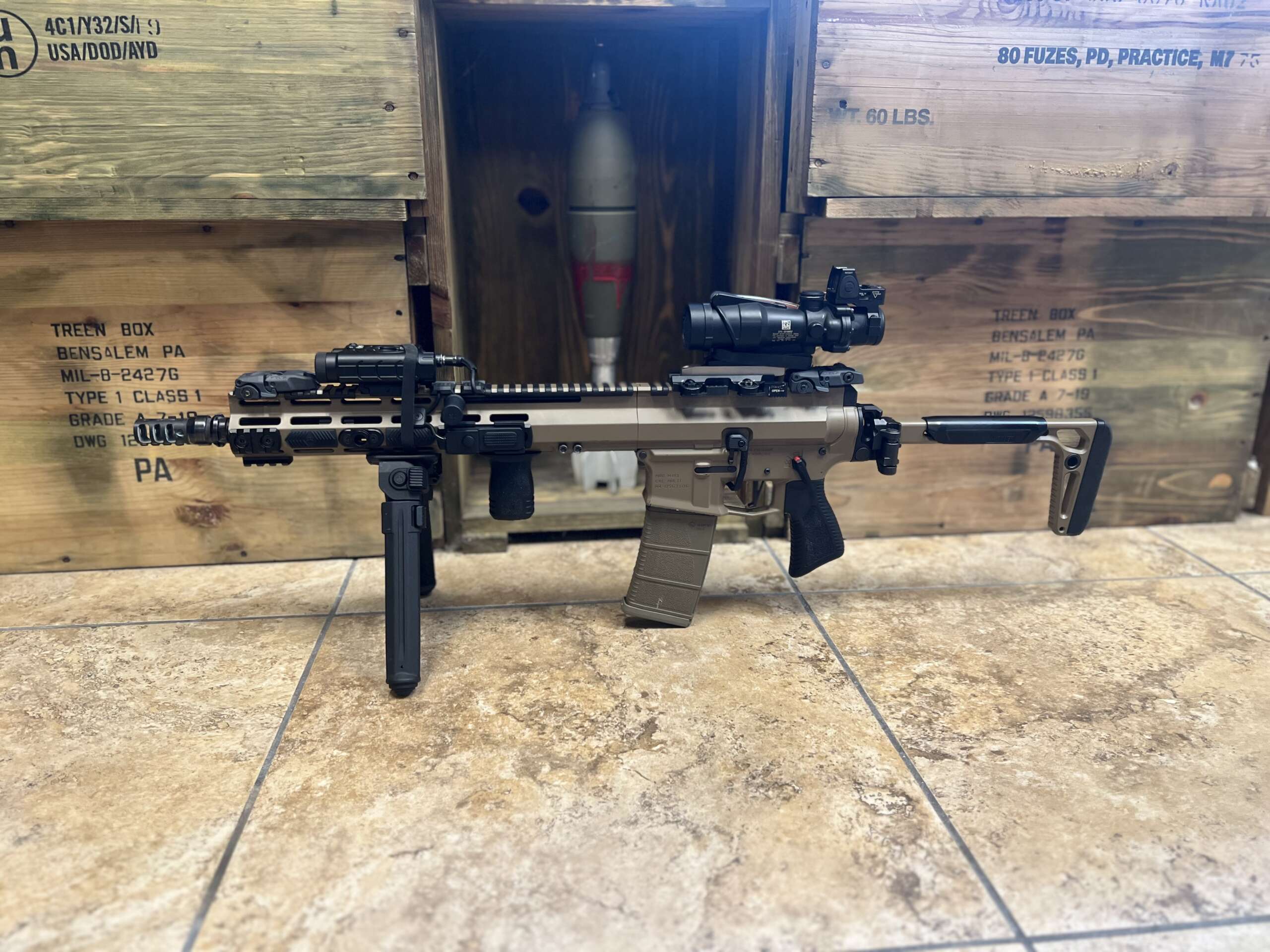 Going out today is a build that has some cool parts. It’s an Aero M4E1 lower with a CMC trigger. It has a FM-15 side charge upper, Magpul bipod, Sig stock, and a Trijicon 4×32 ACOG, with RMR on top of it. The whole package costs $1399.99.